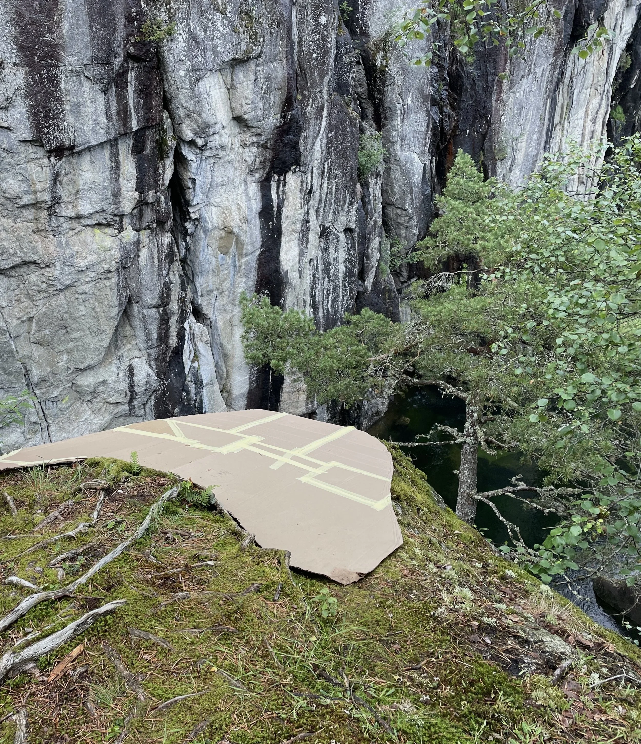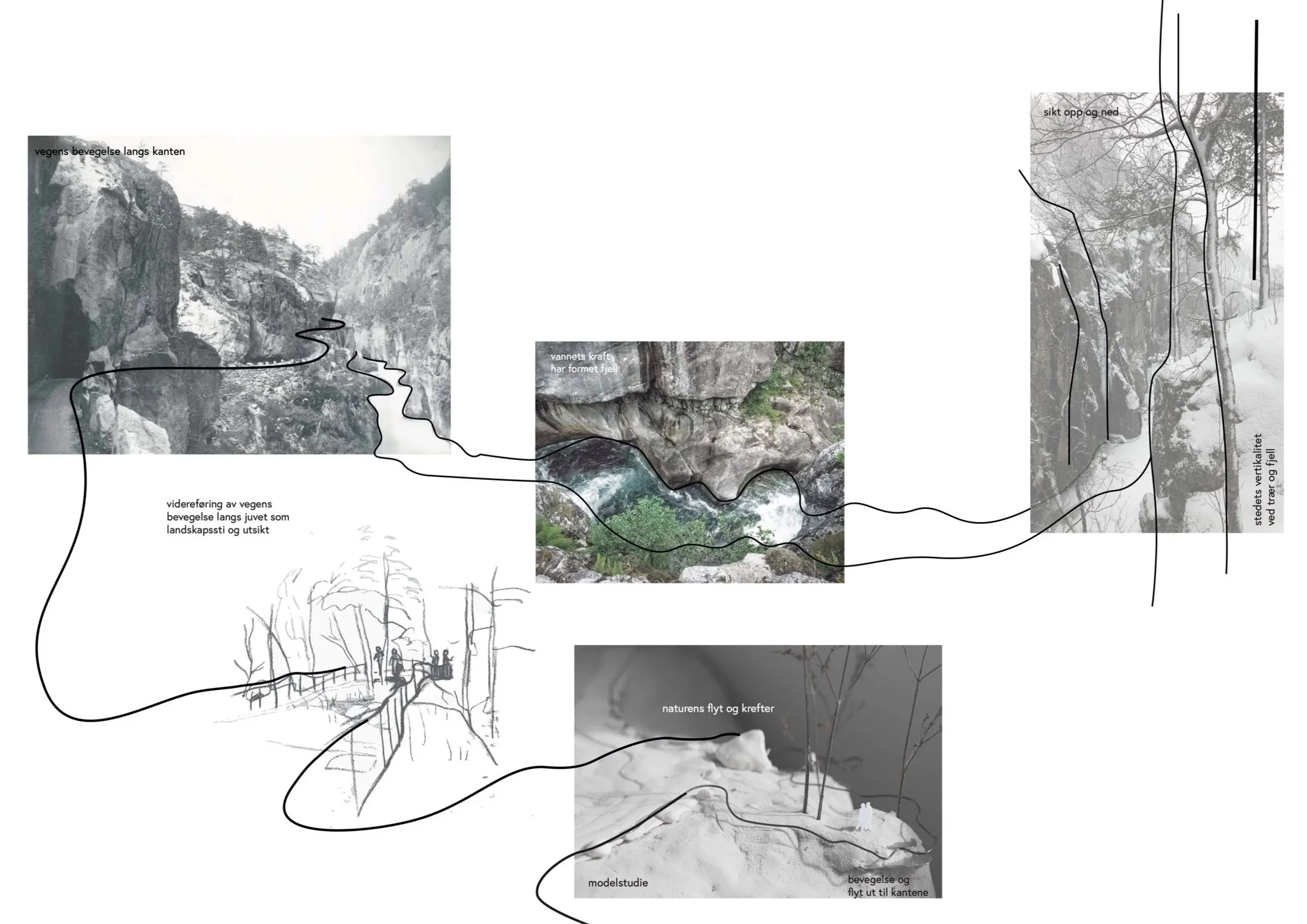 Det historiske veirekkverket rundt parkeringslommen åpnes opp mellom stabbesteinene, og føyes sammen med det nye som slynger seg elegant utover knausen. Det reagerer på terrengets former og speiler både elvens bevegelse og juvets dynamiske form.