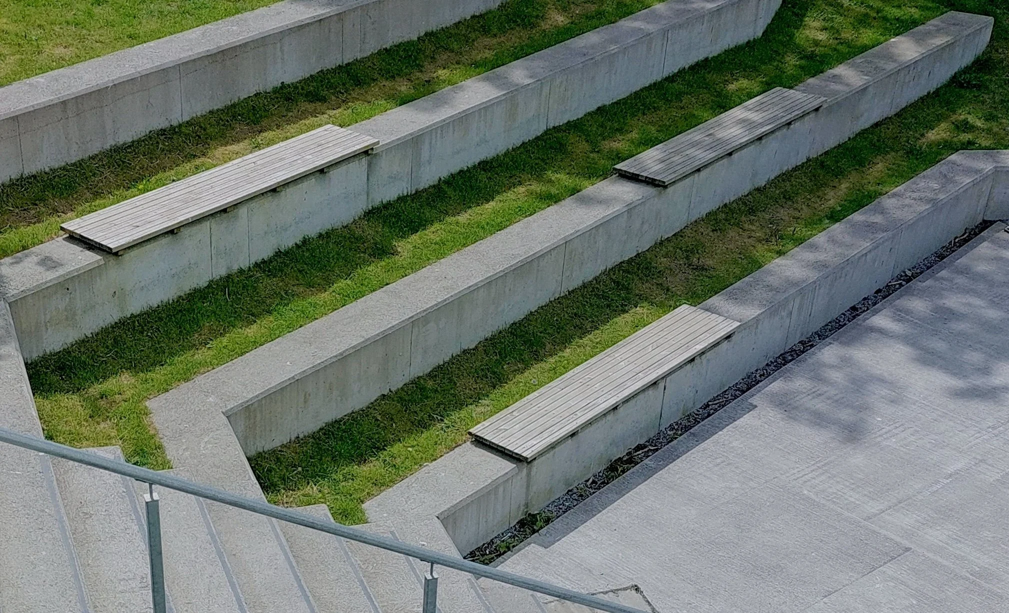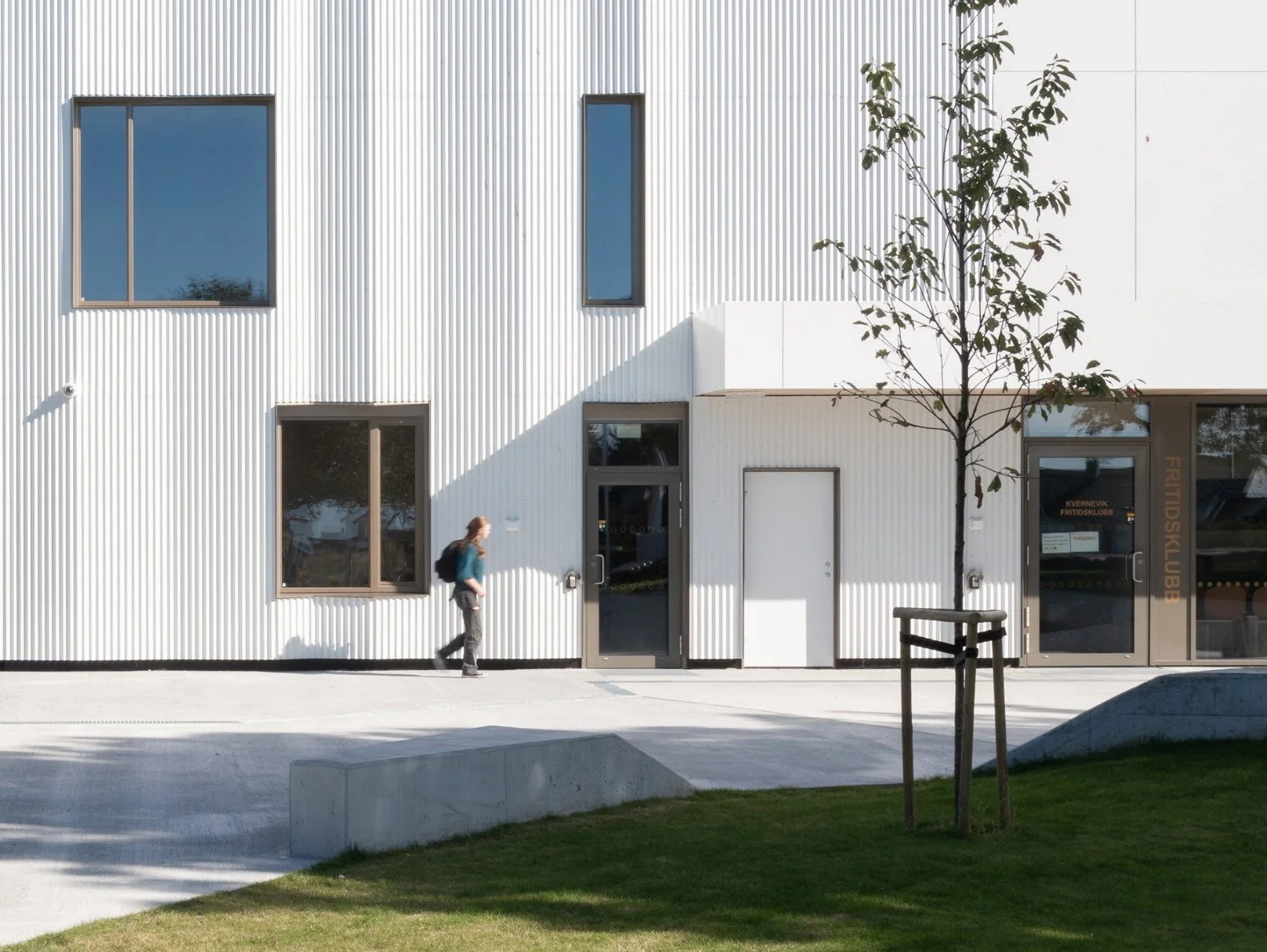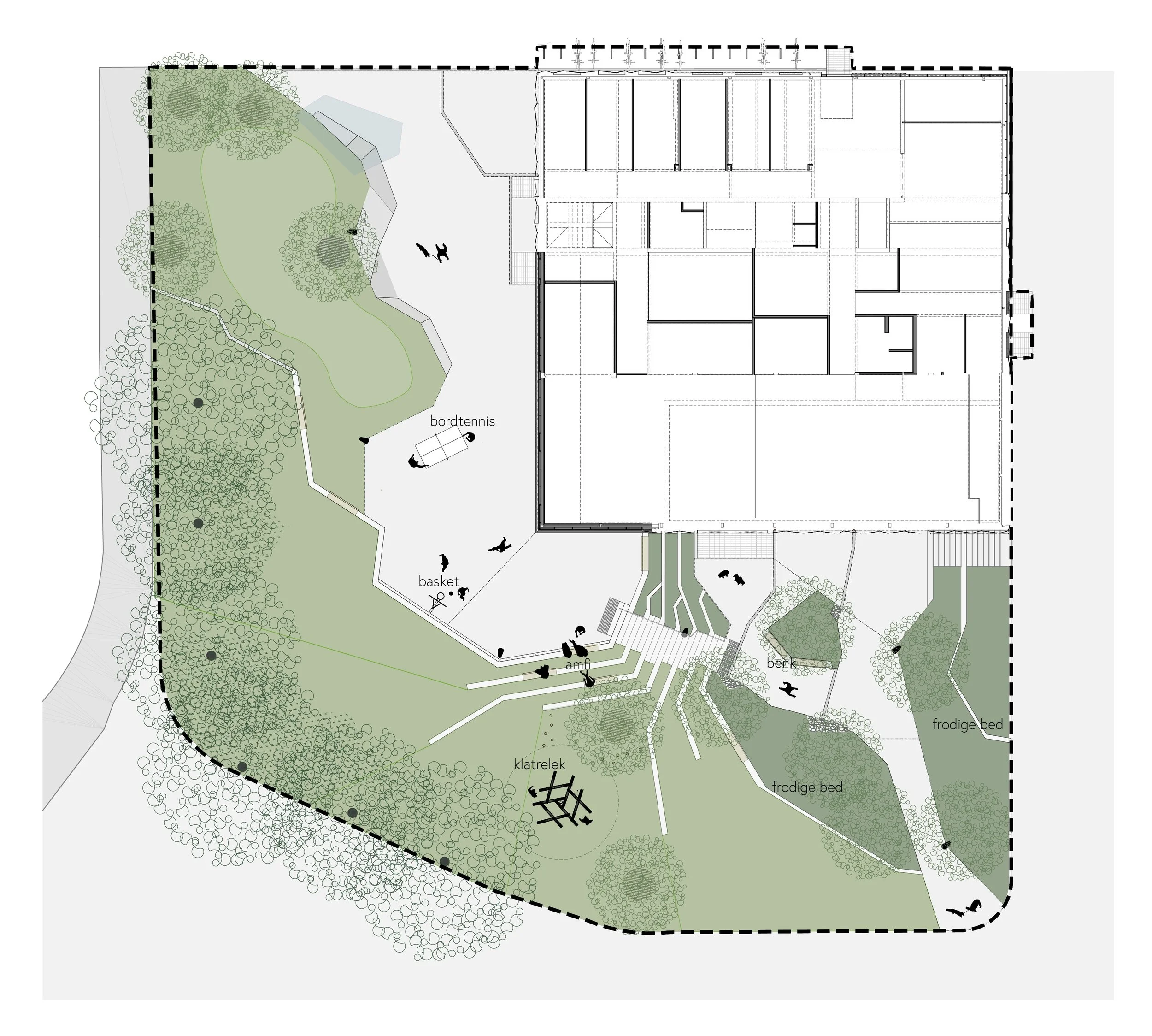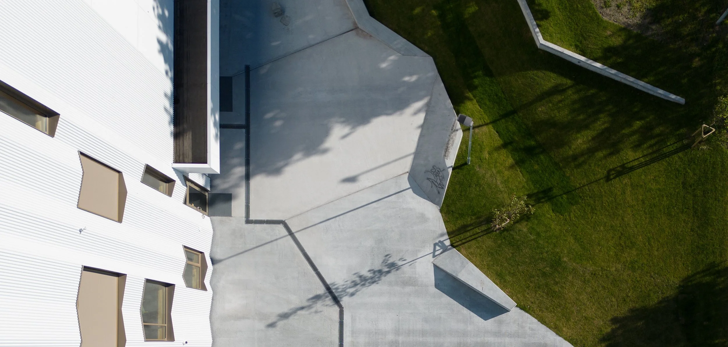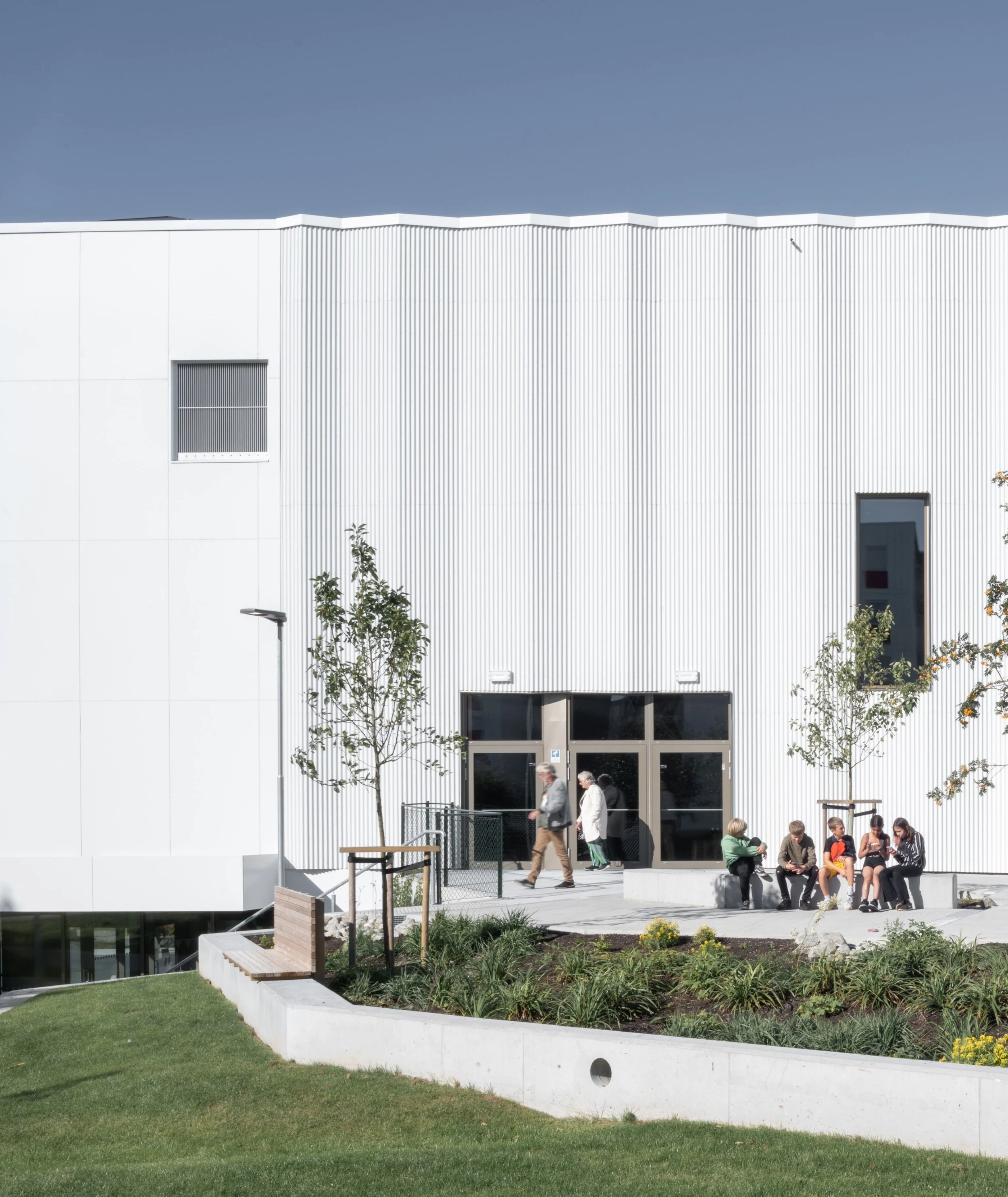 Et amfi med et særegent formgrep legger seg fint rundt bygget, kobler sammen nivåer og inviterer til fysisk aktivitet og opphold i nærkontakt med det grønne, samtidig som det utvider byggets bruksområder. Amfiet omslutter et samlingssted foran ungdomsklubben i underetasjen som inviterer til mangfoldige aktiviteter spesielt rettet mot ungdommer: scene, ballspill, rulleaktiviteter, m.m. På det øverste nivået i direkte tilknytning til salen legger en liten rolig og solrik plass til rette for opphold både ved arrangementer i salen og i hverdagen.