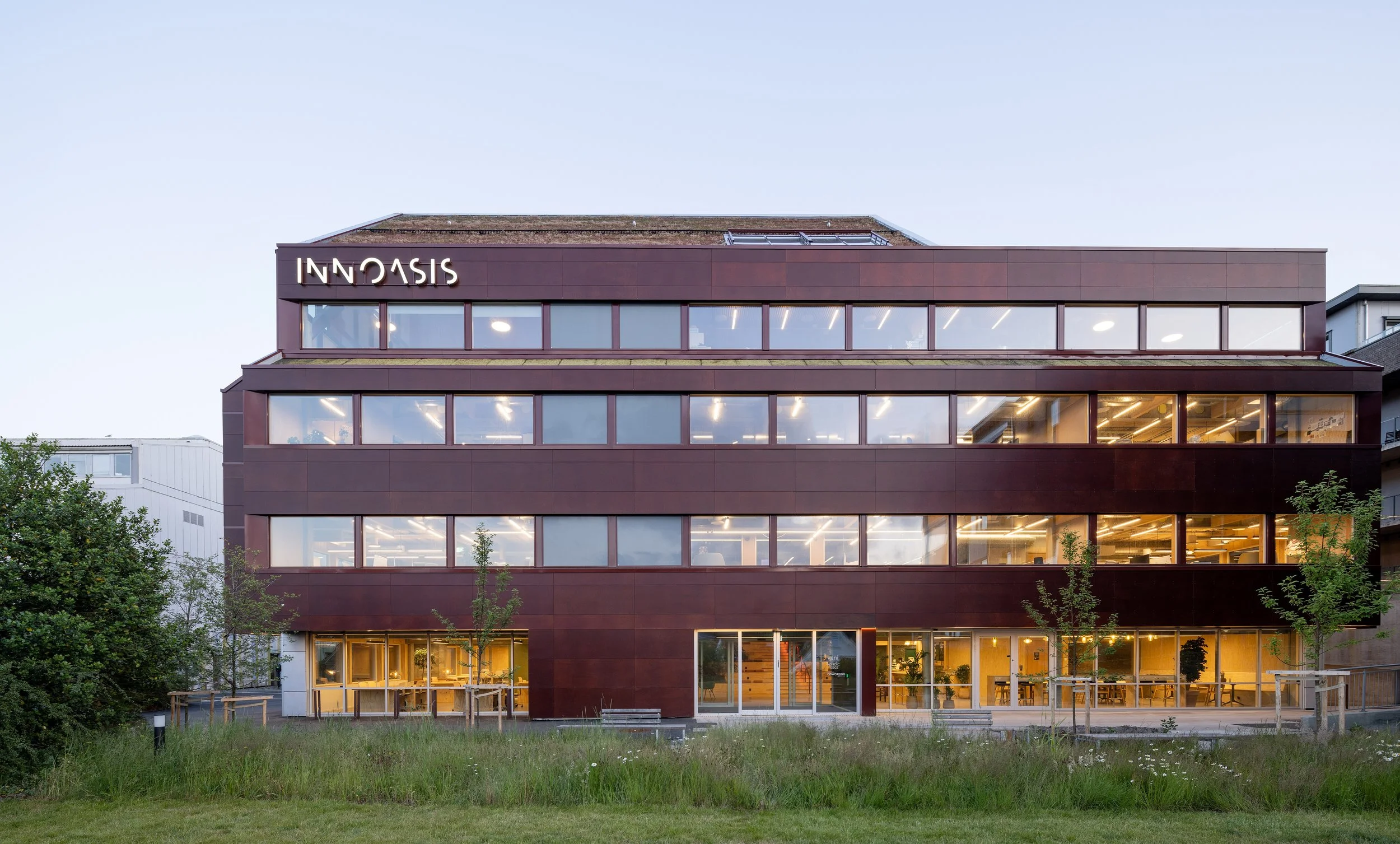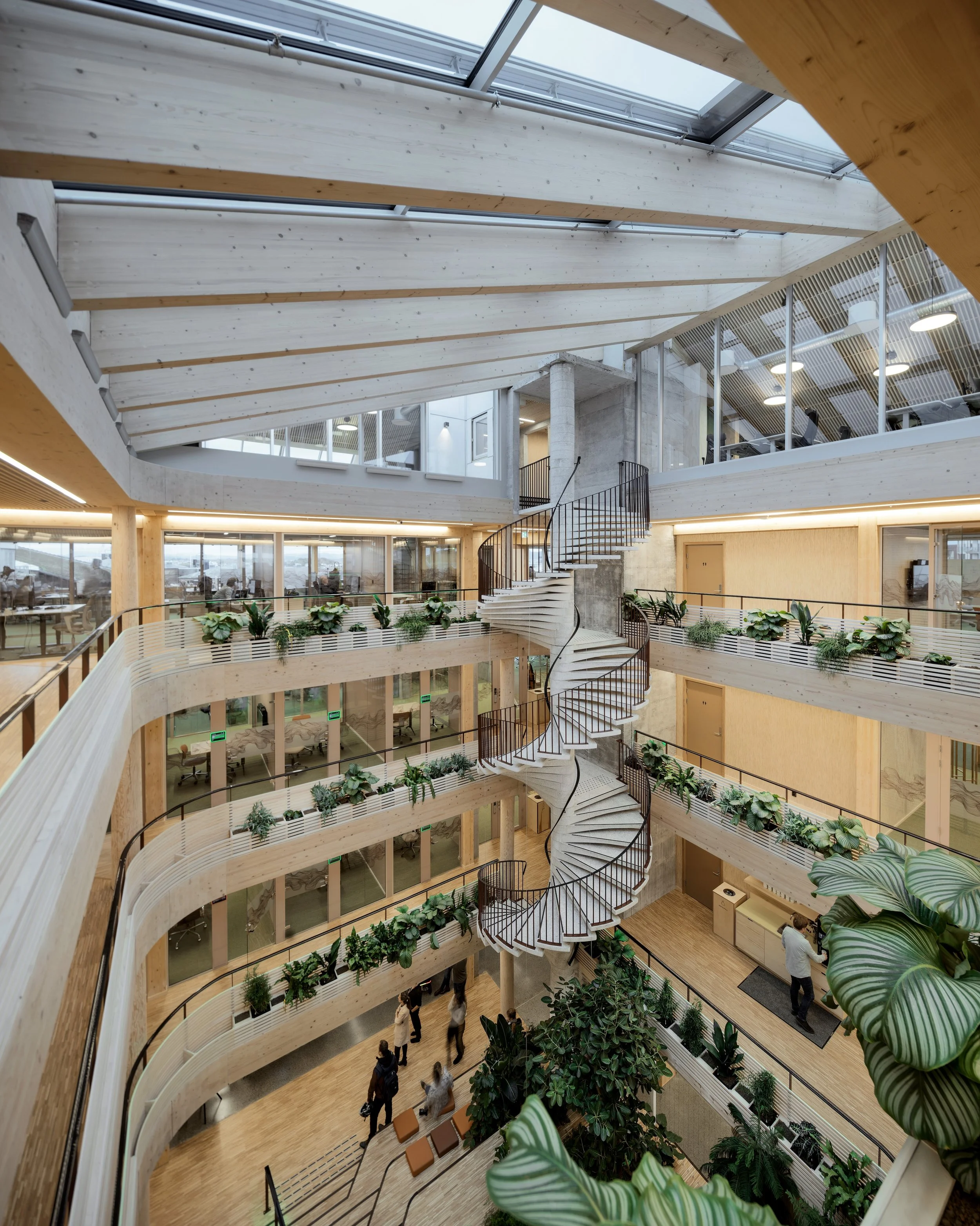 Det opprinnelige bygget med en bærestruktur i betong hadde et åpent atrium som ble glasset inn og kledd med tre. Et amfi forbinder inngangsplan og underetasjen til et varmt og innbydende samlingssted, der integrert beplantning i sittetrinnene og langs rekkverkene oppover i etasjene skaper frodige rammer rundt opphold og arrangementer, og grønne pauser i arbeidshverdagen.